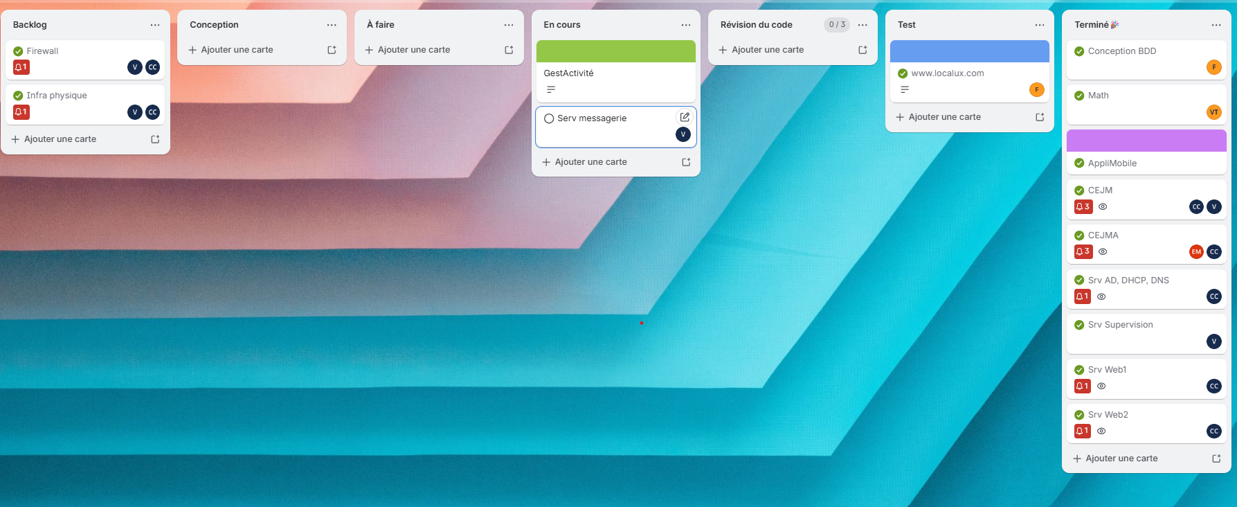 Parmi les cinq membres du groupe, nous nous sommes réparti les tâches en fonction de nos spécialités. Avec mon binôme de spécialité SISR, nous nous sommes chargés de la conception de l’infrastructure réseau ainsi que de la mise en œuvre d’outils destinés à nos collègues de la spécialité SLAM, qui se sont occupés de la programmation.