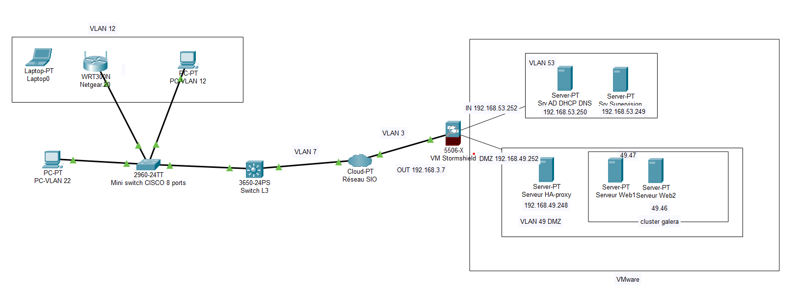 Pour ce projet, nous disposions d’un switch Cisco relié au switch L3 du réseau SIO. Nous avions également un point d’accès, une VM Stormshield et d’autres VM que j’expliciterai ci-dessous.