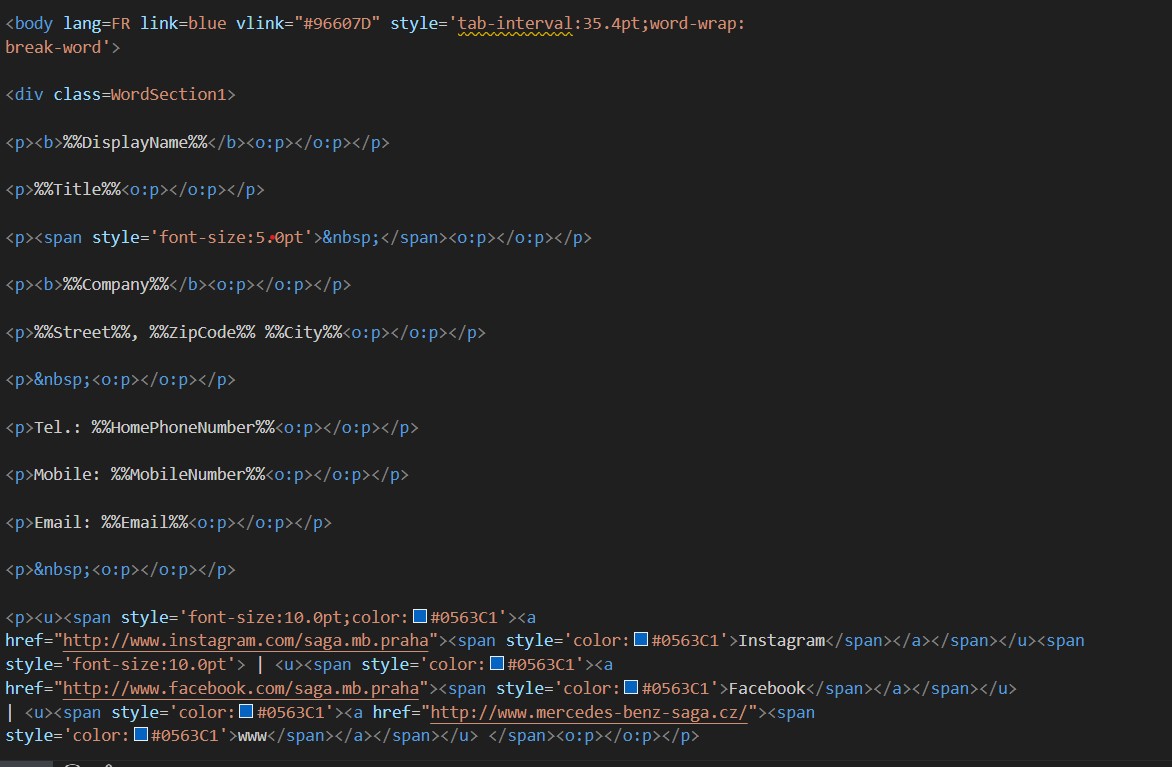 Étant donné que le serveur de messagerie utilise Outlook, j’ai créé un exemple de signature directement depuis cette application. Dans le template, j’ai utilisé des variables permettant de récupérer automatiquement les informations contenues dans l’Active Directory.